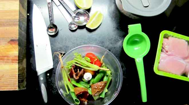 1. Cover the chipotle chilli in boiling water and soak whilst preparing the other ingredients. Take the coriander roots and stems, cherry tomatoes, red chilli and spring onions on top of the soaking chiptole until later.